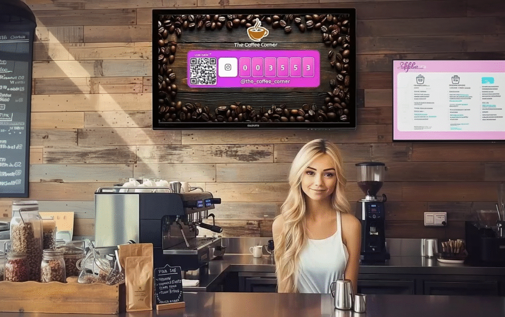 Put one screen in your window to catch foot traffic. Put another inside to convert customers into your marketing team. Watch your reviews grow and your following build — automatically.