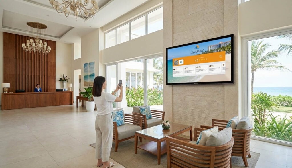 When guests see your reviews on a screen in the lobby, something psychological happens. They read testimonials from other travelers — “Friendliest staff ever,” “Felt like home,” “Best breakfast in town” — and they start noticing those things themselves.