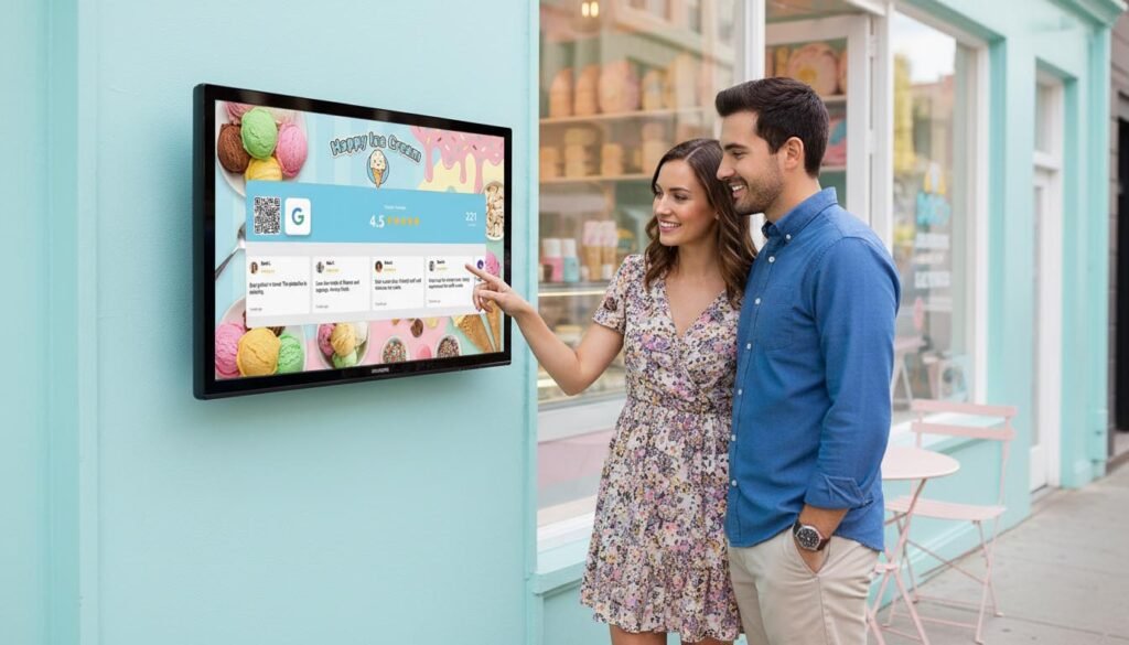 A simple screen or sign showing your Google rating does more than any “Award-Winning Ice Cream” banner ever could.